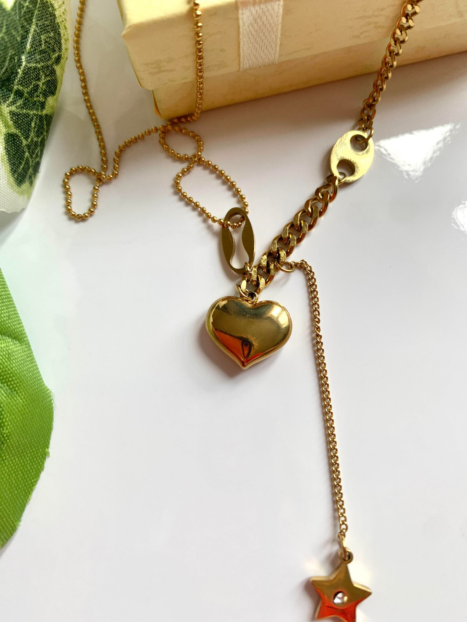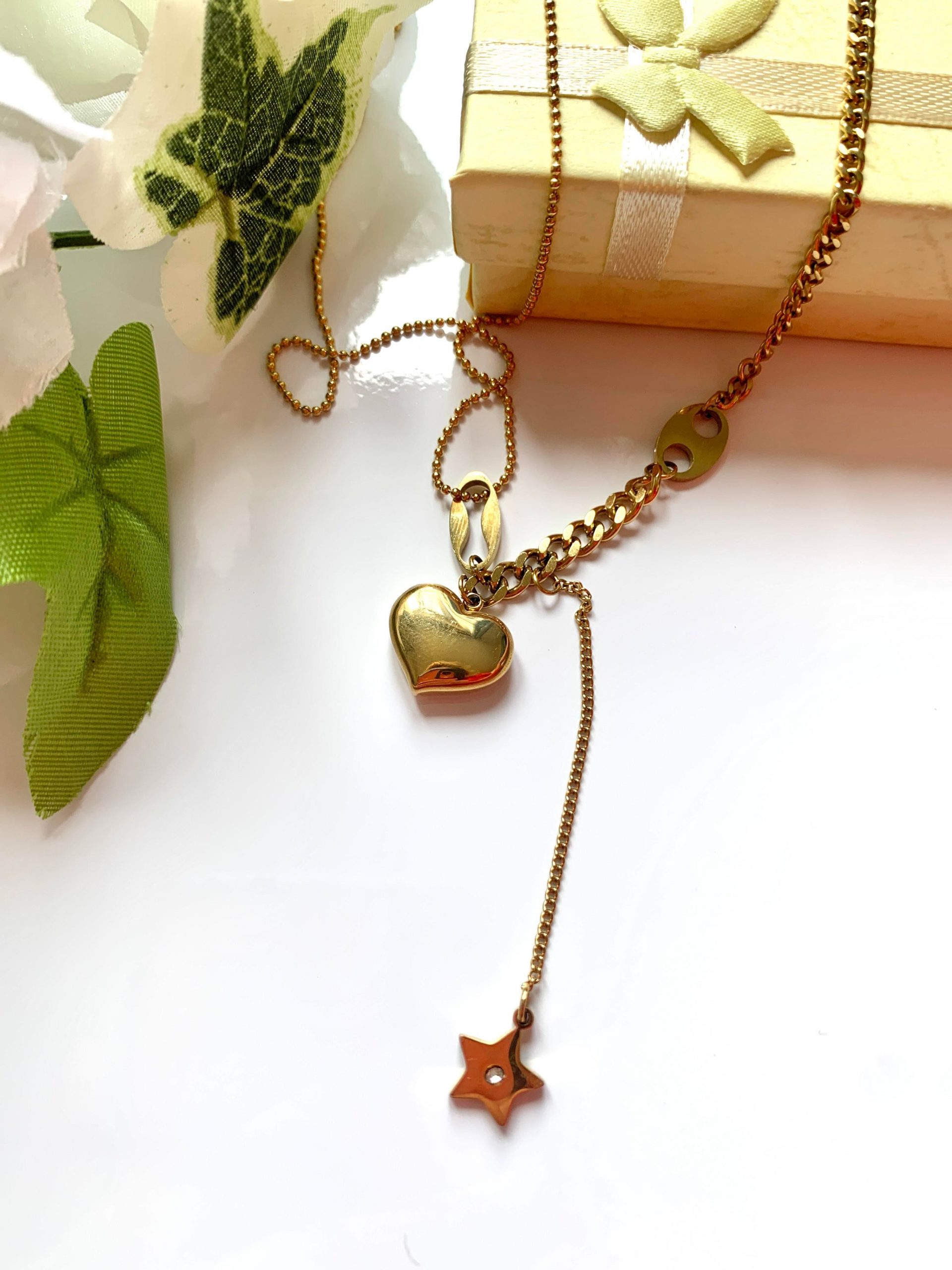 this unique design of necklace ,it is now in our shop.18kgold plated on steel, very high quality 316L of stainless steel, heart ,heart charm, star charm, gold plated, necklace,double necklace,waterproof necklace, tarnish free.Perfect for you or for gift, anniversary ,party.