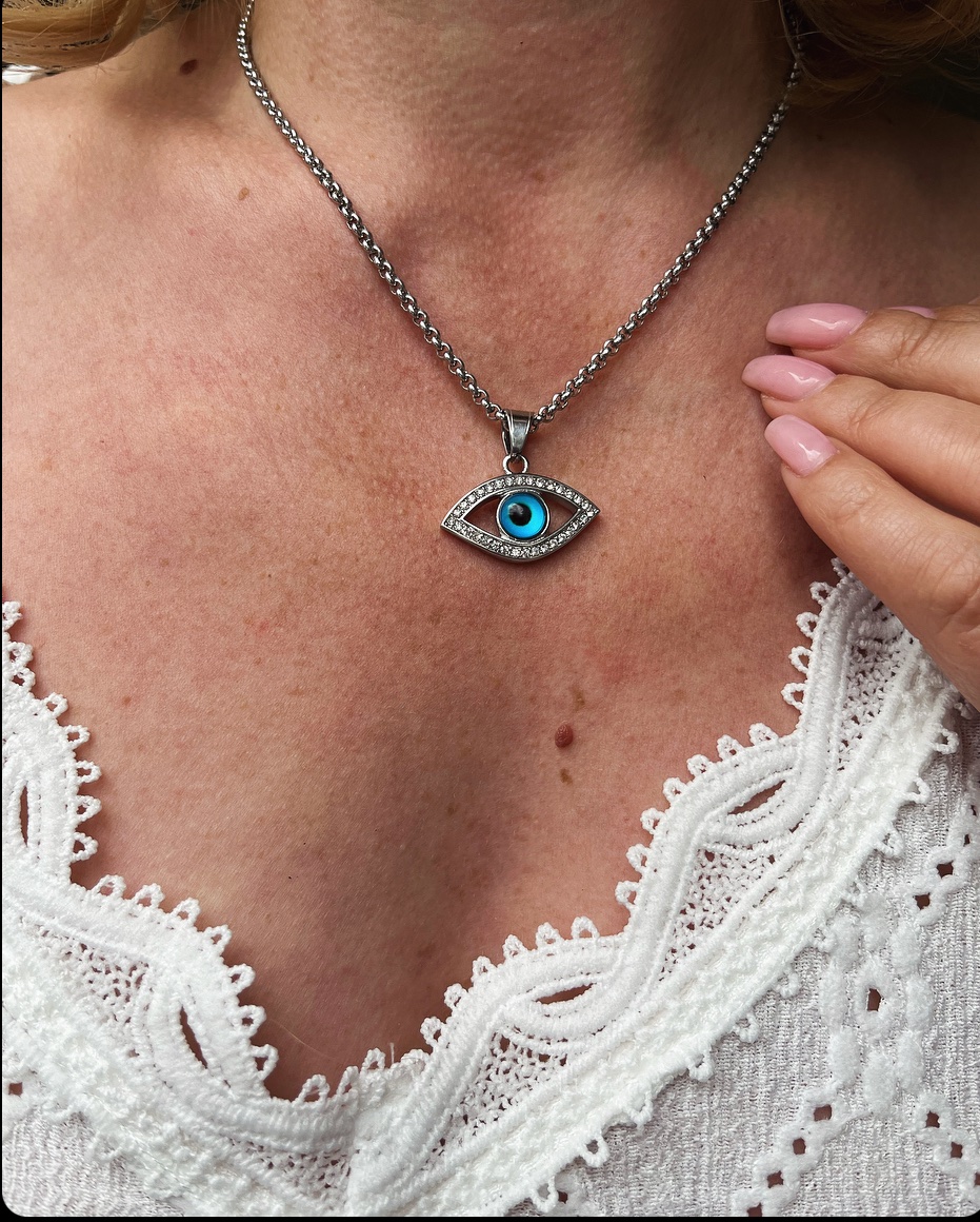 Stunning evil eye, Turkish eye pendant necklace, plated with 18k gold on stainless steel, hypoallergenic ,waterproof ,20inches.We have in silver color or in gold. For more question please feel free to contact me.